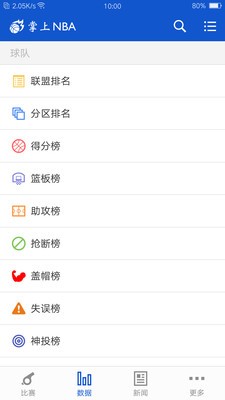 7、技术统计,包括得分榜,篮板榜,助攻榜,抢断榜,盖帽榜,失误榜,神投榜,三分榜和罚球榜;